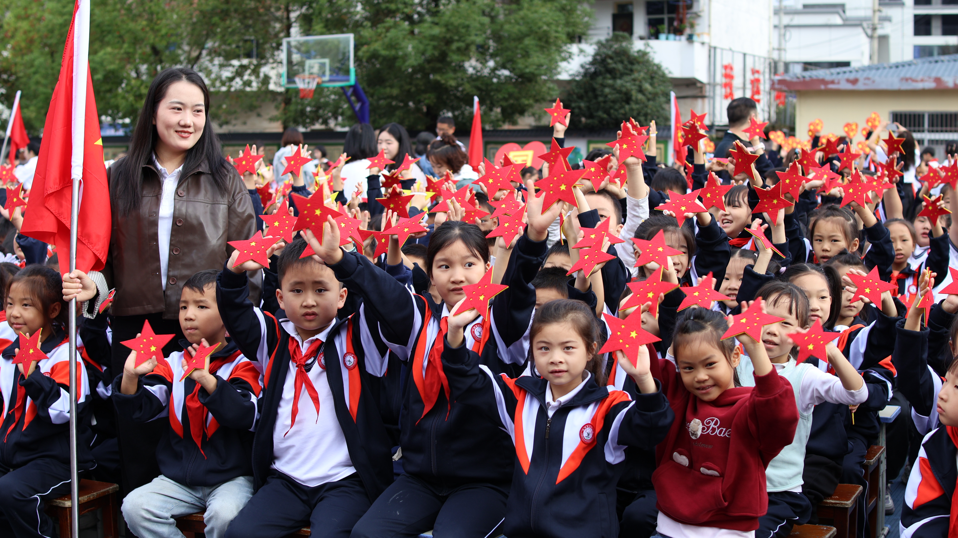 红歌传唱环节中,各年级师生依次登场,用最饱满的热情、最嘹亮的歌声,演绎一首首经典红歌,传递对祖国的无限热爱。活动尾声,全体师生齐唱《歌唱祖国》,6位教师代表高举五星红旗,从学生头顶缓缓经过,鲜红国旗与孩子们的笑脸交相辉映。这一传递仪式不仅是视觉的震撼,更是爱国情怀的接力传承。