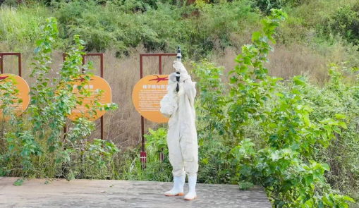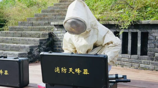 在一处胡蜂蜂巢处置现场,记者全程见证了高效处置过程:消防队员身着崭新防蜂服,手持配备激光瞄准功能的灭蜂枪,无需近距离接触蜂巢即可展开操作。随着药剂精准喷射,胡蜂活动迅速受控,整个处置流程安全有序、高效快捷,有效降低了作业风险。