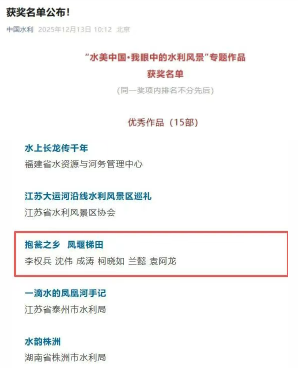 《抱瓮之乡凤堰梯田》聚焦汉阴县凤堰梯田这一世界灌溉工程遗产。其“田、渠、塘、溪”灌溉系统,借自然之力,用山地之势,实现自流灌溉,有效减少水土流失,是古人智慧的结晶。此次《抱瓮之乡凤堰梯田》获奖,不仅是对凤堰梯田这一独特水利风景的认可,更是对汉阴县在水生态文明建设和水文化传播方面工作的肯定。