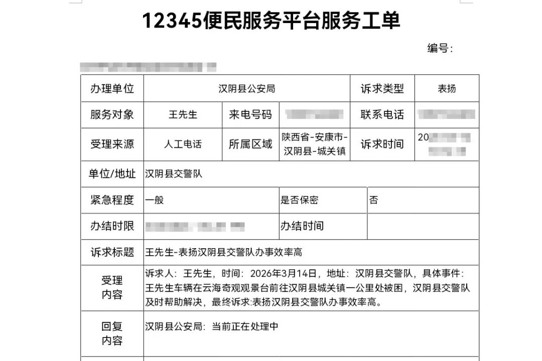 救援虽已结束,温情却未止步。被救群众专门通过12345政务服务便民热线发来一份情真意切的“表扬工单”,字里行间满是对汉阴公安交警危难时刻显身手的感激与赞扬。