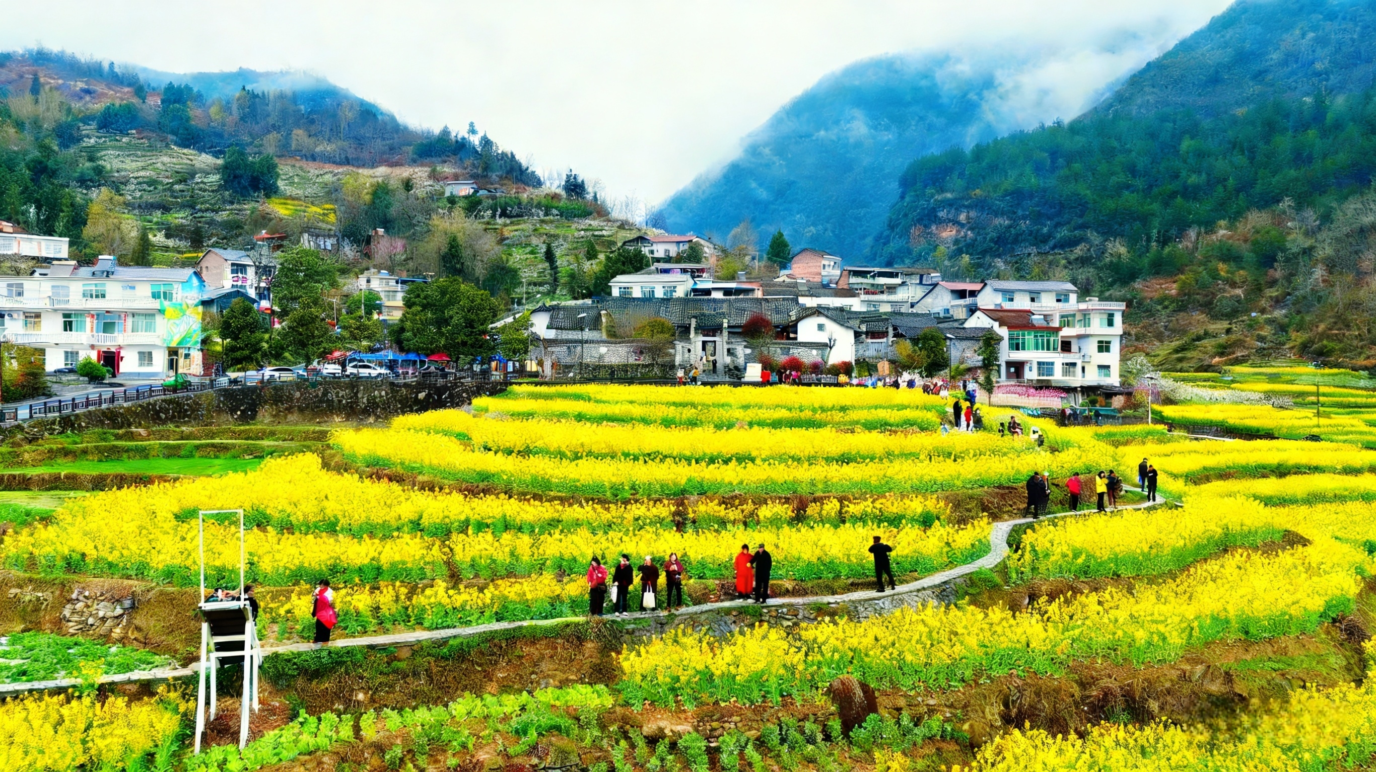 夕阳西下,金黄的油菜花海在落日余晖中更显绚烂,景区依然游人如织。吴大云的干菜摊前,讨价还价声还在继续;陈昌松的套圈摊上,欢笑声此起彼伏;农家乐的厨房里,锅碗瓢盆奏响了幸福乐章。