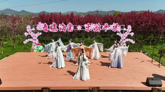 走进海棠园田野舞台,连片的海棠花竞相绽放,与翠绿的田野相映成趣。活动现场,汉服游园环节率先点燃了游客的热情。身着各式华美汉服的爱好者们漫步花间,衣袂飘飘,仿佛将时光拉回了古韵悠长的岁月,引得众多游客驻足拍照,亲身感受传统文化的独特魅力。