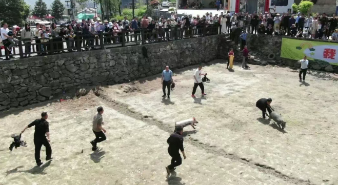 抓猪活动现场气氛爆棚。随着开赛信号响起,参赛选手们纷纷冲入赛场,在田野间与小猪展开趣味追逐。大家健步如飞、围追堵截,泥土轻轻飞溅,身影灵活穿梭,紧张又欢乐的氛围瞬间拉满。大家协作配合,在奔跑与嬉闹中找回童年野趣。来自西安的游客张先生兴奋地说:“参加抓猪比赛太有意思了,跟小时候过年杀年猪的感觉一模一样,接地气、够热闹,玩得特别尽兴!”