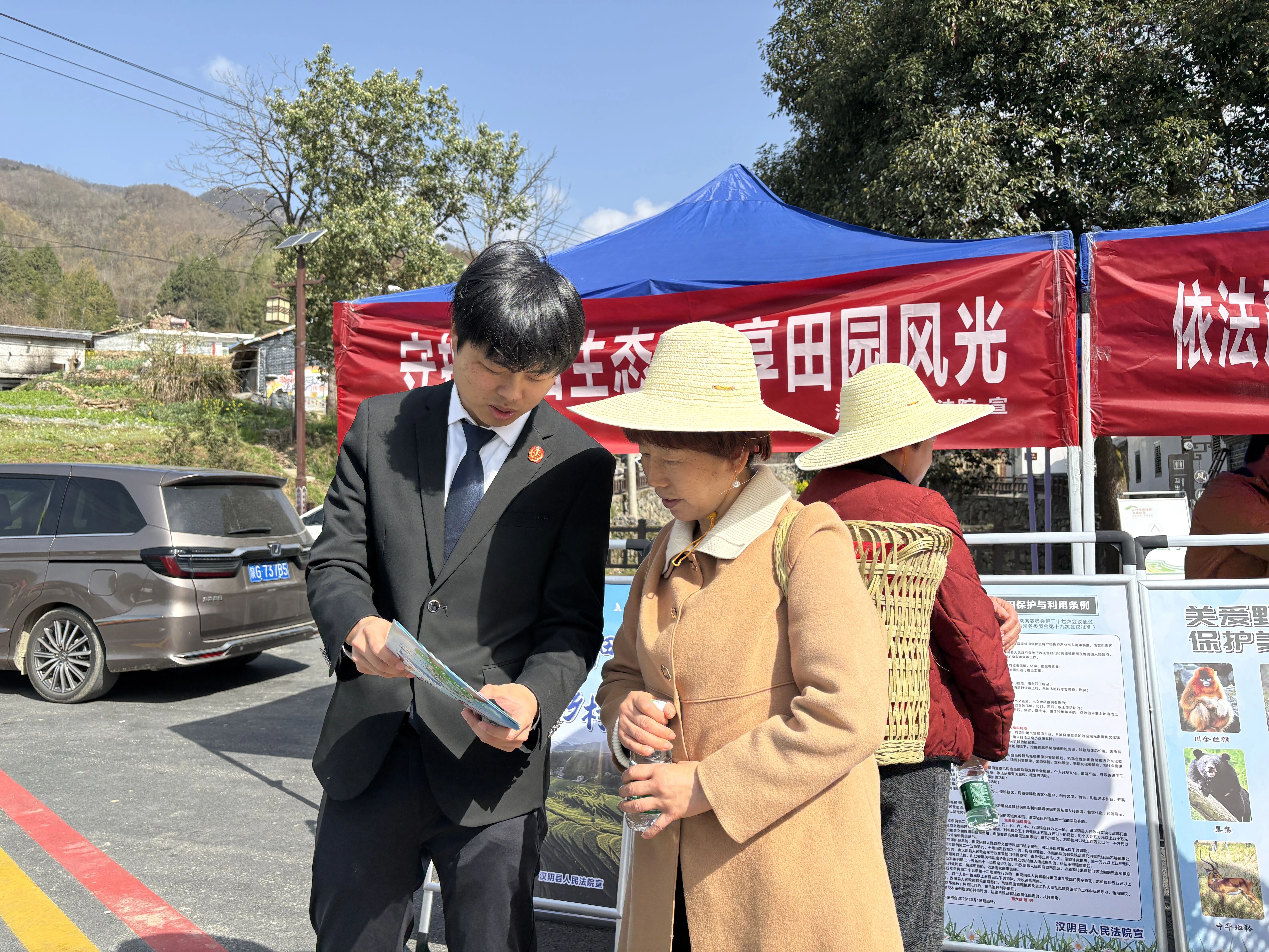 “老乡,凤堰梯田有专门法规保护啦,快来了解一下!”“小朋友,这些都是咱们当地的野生保护动物,一起认识下吧!”“游客朋友们,游玩时请爱护水利设施与历史遗存,共同守护绿水青山。”2026年3月20日,汉阴法院干警走进景区游客密集区域,开展梯田生态与文化保护专项普法活动。通过讲解梯田历史文脉、普及野生动植物知识、解读保护条例等形式,持续提升群众与游客的保护自觉,着力营造“保护人人有责、参与人人尽责、成果人人共享”的浓厚社会氛围。