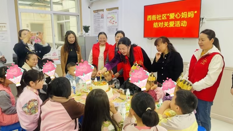 活动伊始,社区负责人详细介绍了辖区留守困境儿童整体情况,县妇联刘主席表达了对孩子们的关怀与鼓励,并通报“爱心妈妈”志愿服务队伍招募和组成情况,以及举办此次活动的重要意义。紧接着,便正式启动“爱心妈妈”结对仪式,“爱心妈妈”与需要帮助的儿童进行结对,并填写认领表。其中一位“爱心妈妈”表示:“很高兴能成为一名‘爱心妈妈’,我将发挥自身特长和优势,在孩子的生活和学习上给予力所能及的帮助。”结对仪式结束后,爱心妈妈为孩子们送上了钢笔、绘本、马克笔等学习用品。同时,为让9名特殊儿童感受到社会大家庭的温暖,社区还为十月份出生的孩子准备了一个大蛋糕,集体过了一个难忘的生日。