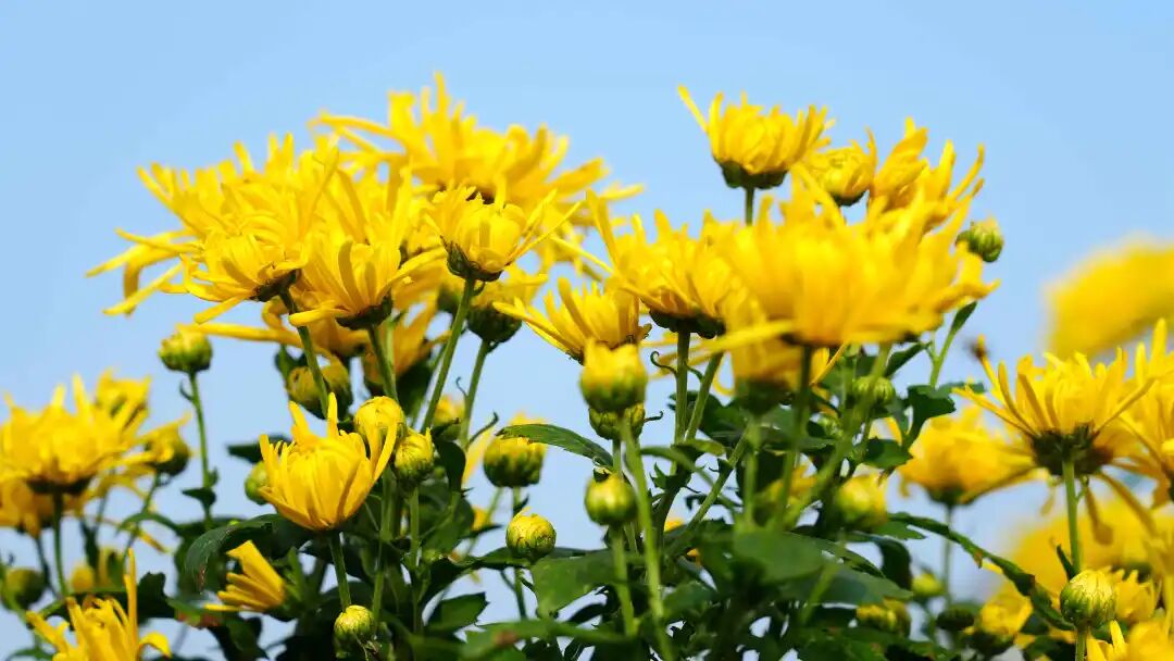 【这几年,一到菊花盛开的时候,我们都会约上三五个好朋友来赏花,看到菊花黄艳艳的,心情也好了。】