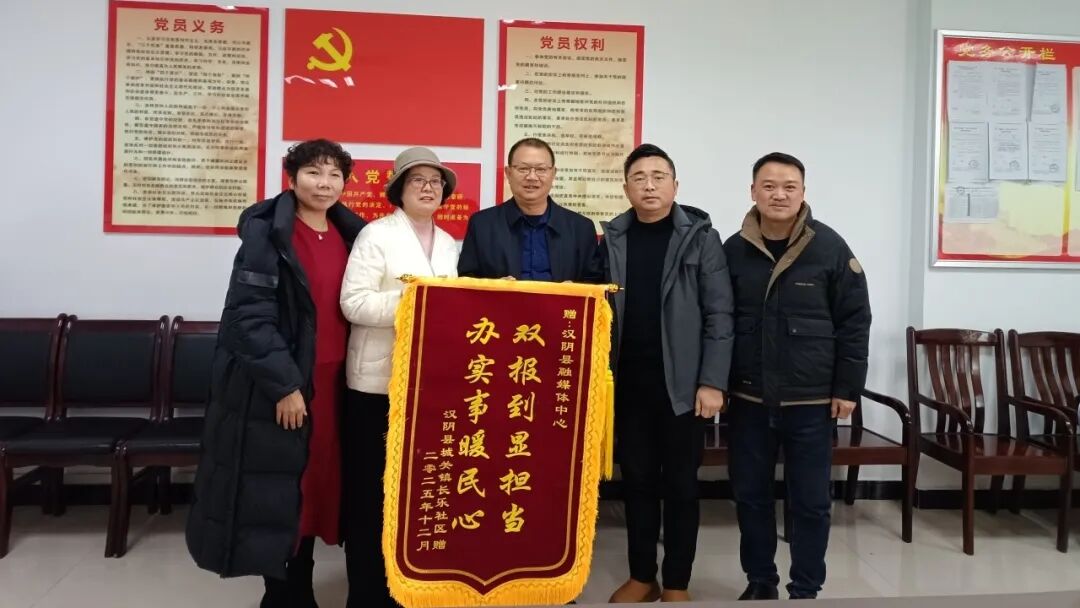 12月24日,汉阴县城关镇长乐社区党总支书记赵红霞一行专程来到汉阴县融媒体中心,将一面写有“办实事暖民心 双报到显担当”的锦旗送到中心主要负责人手中,以此诚挚感谢汉阴县融媒体中心在“双报到”工作中对社区给予的鼎力支持和深情厚谊。