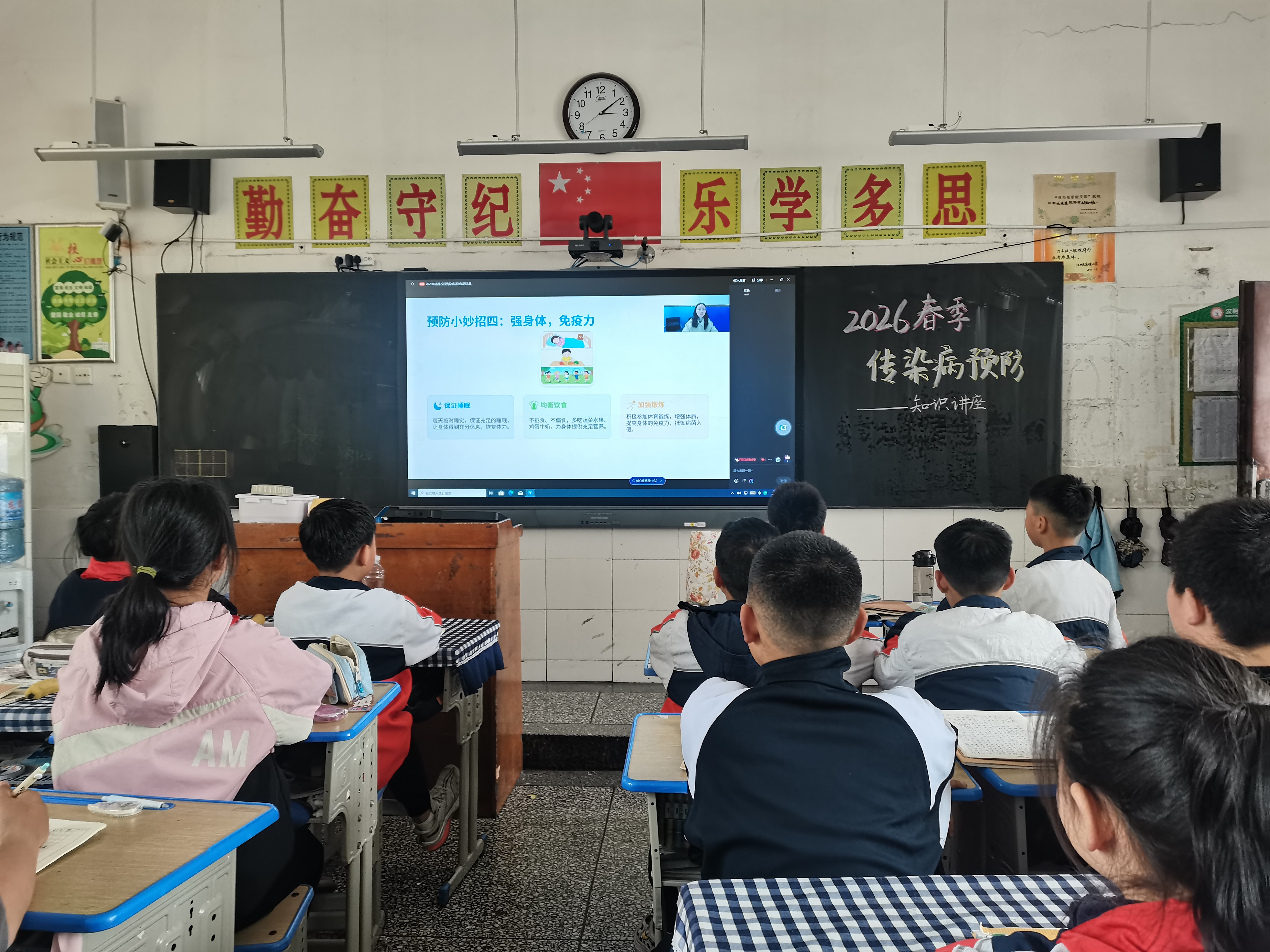 讲座中,医护人员结合小学生认知特点,以通俗易懂的语言、图文并茂的课件,细致讲解春季常见传染病的传播途径、临床症状及科学防控方法,着重强调勤洗手、常通风、规范佩戴口罩、避免前往人群密集场所等关键防护要点。各班学生在班主任组织下,认真观看直播,学习防护知识。
