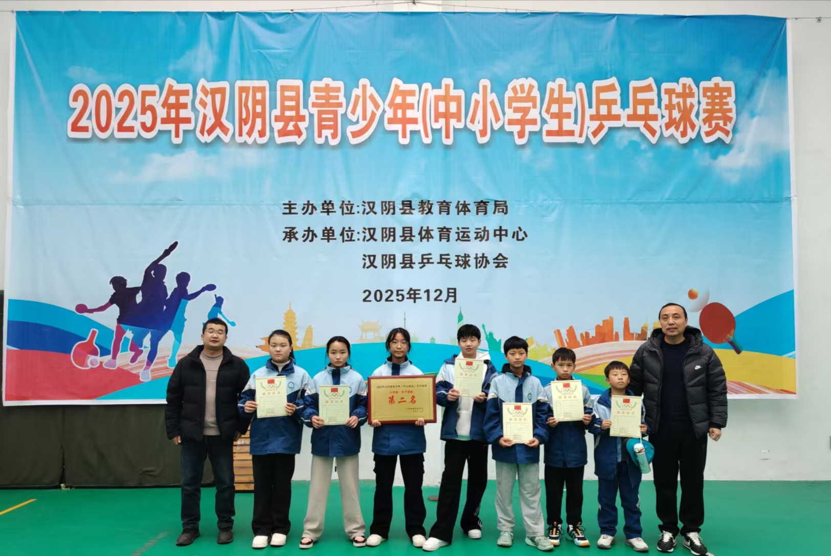 12月19日,汉阴县2025年中小学生乒乓球赛圆满落幕。在本次赛事中,汉阳镇中心小学代表队斩获女子团体第二名,该校学生杨思婍荣获女单第二名、潘可欣荣获女单第三名。