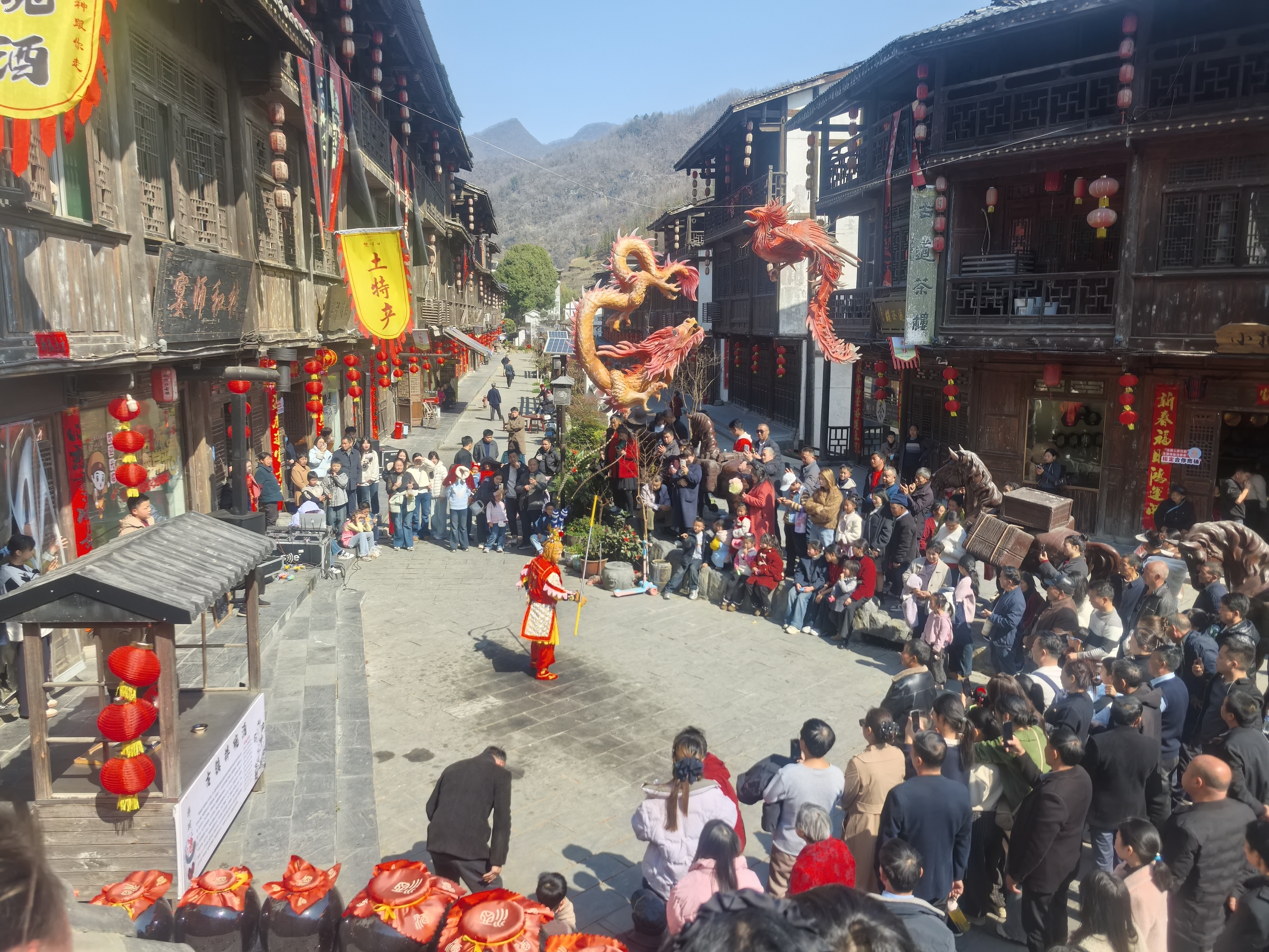 活动点燃热情,古镇年味“天天有惊喜”。大年初三起,“乡味比拼”热闹开场,抓马游戏、水缸投壶、活字印刷体验、银票兑换、K歌点唱等互动项目接连上演,游客穿梭其间,沉浸式感受乡土趣味;“财神巡街”更是把好运洒满街头,大人小孩争相合影,讨个新年好彩头。元宵之夜,“烧火狮子”将节日氛围推向高潮,锣鼓喧天中,火狮子时而腾跃、时而嬉戏,赢得阵阵喝彩,五彩斑斓的烟花映照着古街屋檐,流光溢彩,如梦如幻。此外,皮影戏、街头艺人表演等民俗展演贯穿始终,让游客在欢笑中触摸古镇的文脉,感受传统文化的温度。