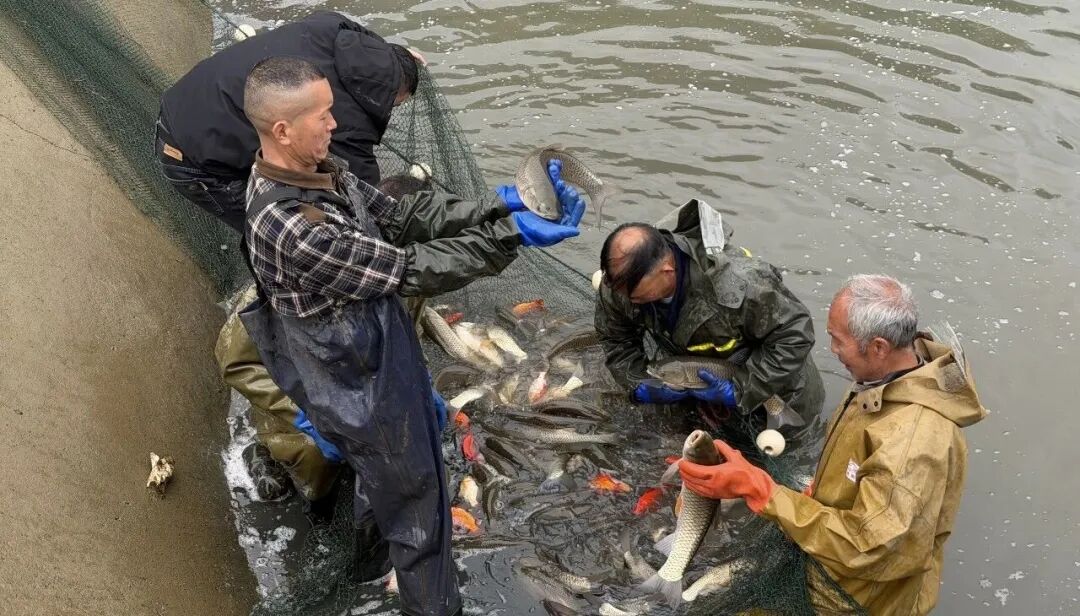 在铁佛寺镇四合村合作社的鱼塘,渔民们合力拉动渔网,肥美的鲢鱼、草鱼、鲤鱼在网中溅起阵阵水花,与岸边村民们的欢声笑语交织成一幅生动的“鱼跃人欢”丰收画卷。本次捕捞的成鱼个头匀称、品质优良,主要供应本地及周边市场。