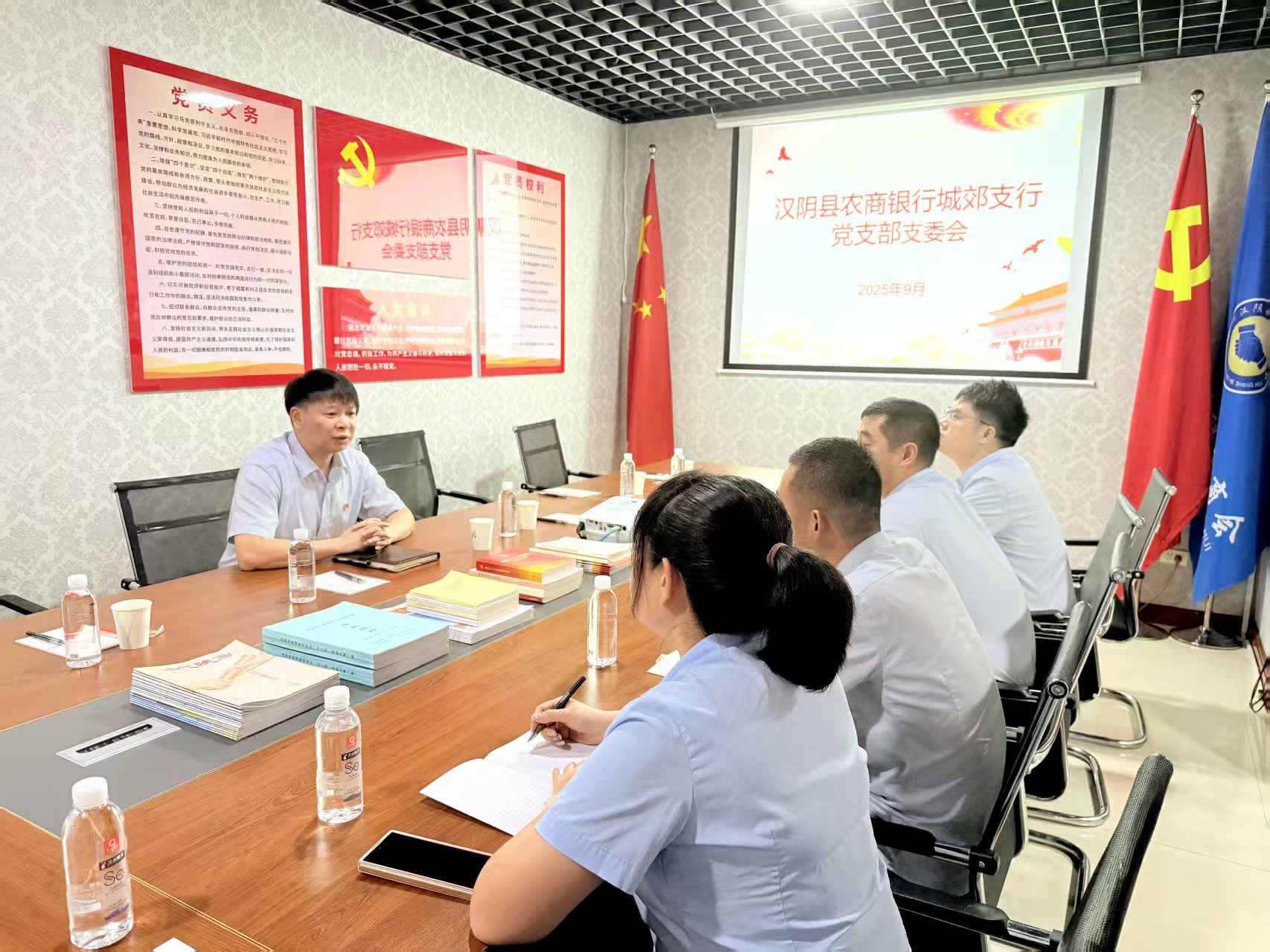 “交融共进”党支部始终将政治理论学习作为“必修课”,通过构建多维度学习体系,把理论成果转化为推动工作的实际动力。以常态化学习为抓手,聚焦习近平总书记关于党的作风建设重要论述《习近平总书记关于党的建设的重要思想概论》等核心内容,通过领学解读、集中研讨深化理解,引导党员结合岗位职责谈感悟、找方向,实现理论学习入脑入心、见行见效。创新开展沉浸式红色教育,联合汉阴县商贸联合商会党支部举办“观阅兵,忆峥嵘,强信念,建新功”主题党日活动,组织党员集中观看阅兵仪式与《觉醒年代》红色影片,并围绕 “新时代金融人的使命担当”专题研讨,既激发爱国情怀,更凝聚起“以金融之力服务地方发展”的干事热情,为“交融共进”注入精神动力。