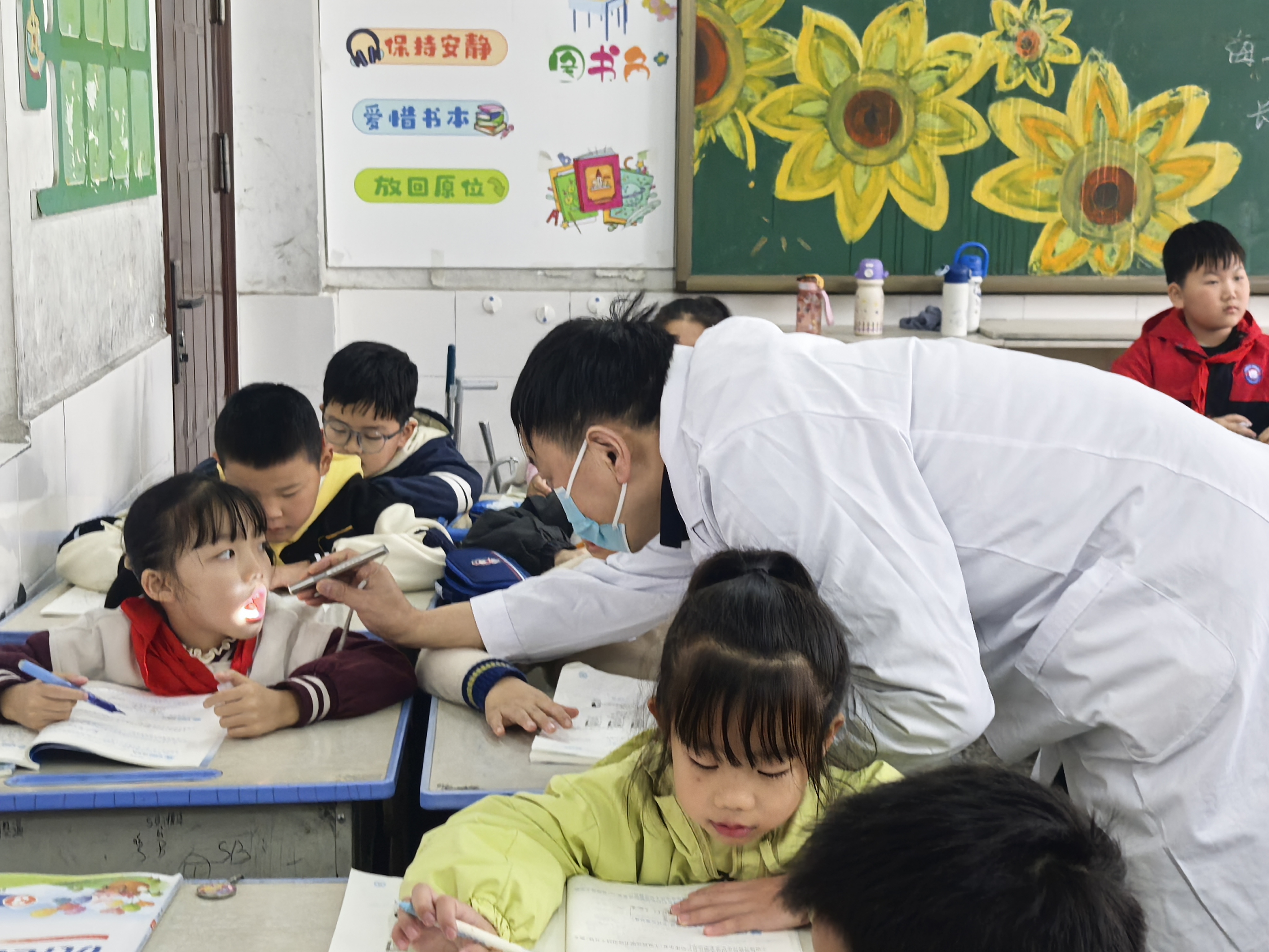筛查现场秩序井然,医护人员耐心细致地为每一位学生检查牙齿状况,根据氟斑牙严重程度进行分类登记。