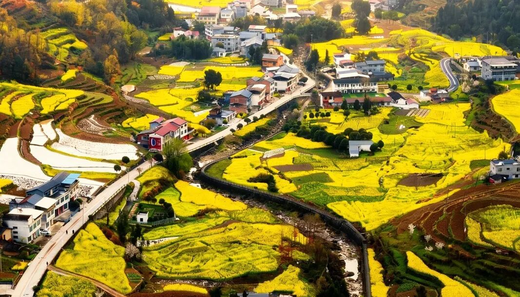 最妙的是傍晚。夕阳西下,余晖给花海镀上一层暖橙色的光。远处的老房子升起炊烟,三三两两的农人扛着锄头走在田埂上,身影在花丛中时隐时现。这时候的花海,褪去了白日的耀眼,多了几分温柔与安详。金黄的波浪静静地铺展着,一直延伸到天际,仿佛要把整个春天,都送到你的梦里去。