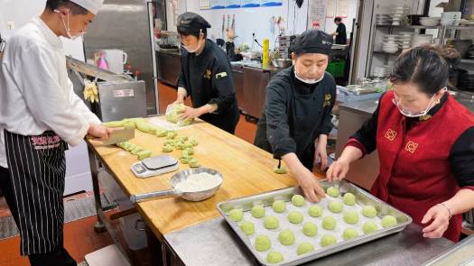 随后厨师和工人们分工协作,一同揉面、揪剂,按照固定的大小比例切分面团,一旁的工人再将切好的面剂逐一揉成圆润可爱的馍坯,一个个小巧饱满,模样规整。全部塑形完成后,再将整齐码好的馍坯放入蒸锅,大火足汽蒸制20分钟。