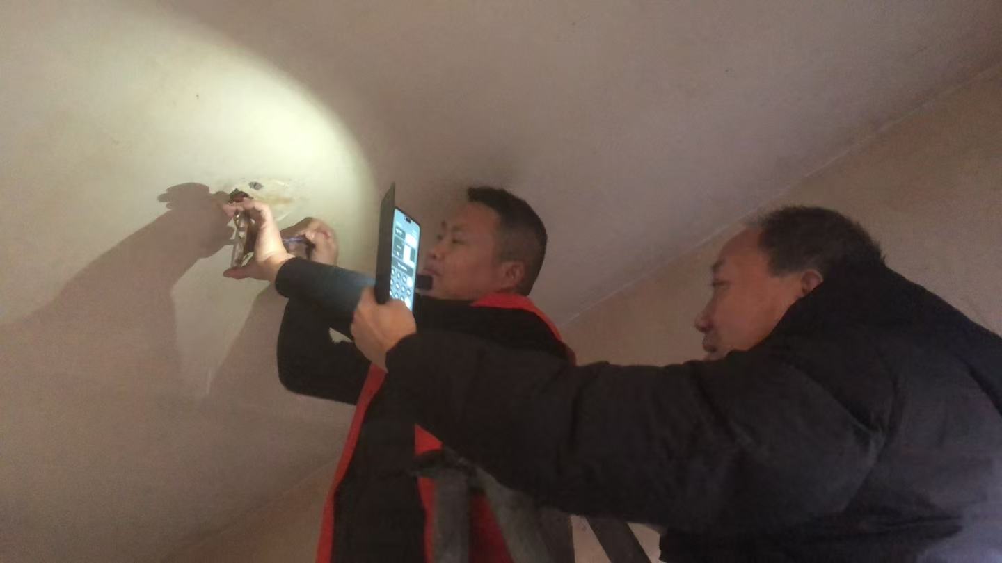 在五保户魏廷元老人家中,工作人员发现室内灯光昏暗,仅靠灶火微光照明。经检查,屋内灯座、灯泡损坏,线路老化,不仅生活不便,更存在用电安全隐患。工作队随即使用随身携带的便民服务工具箱,分工协作,一边检修电路、更换灯泡,一边协助老人完成养老金认证,并讲解相关政策和安全须知。